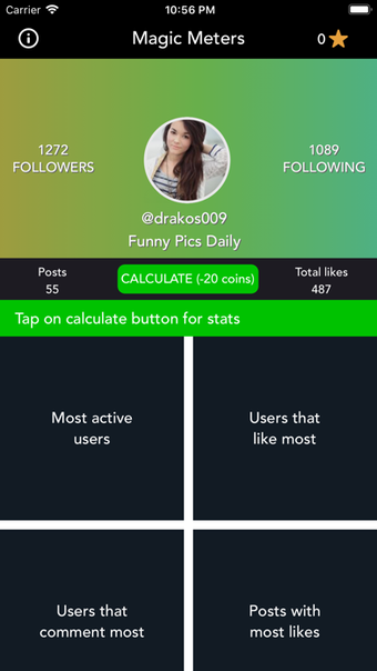 Magic Likes Meters — это простое в использовании приложение. Для начала вы просто открываете приложение и входите в свою учетную запись Instagram , используя учетные данные учетной записи, которую вы хотите отслеживать. В случае успеха приложение перенаправляет вас на домашнюю страницу с дескриптором учетной записи в Instagram и отображаемым изображением. Здесь вы увидите кнопку «Рассчитать», при нажатии которой начнется получение соответствующей статистики из вашей учетной записи.